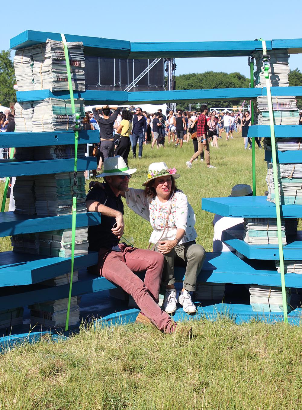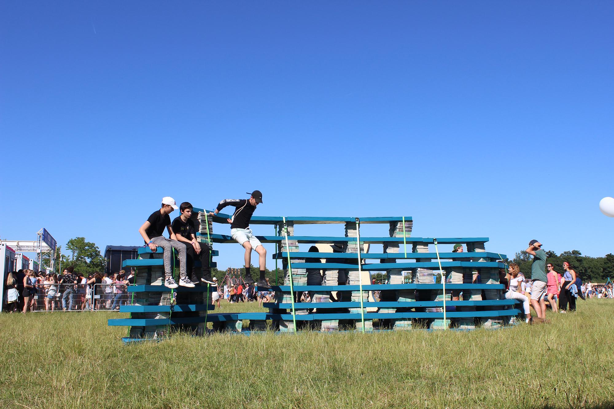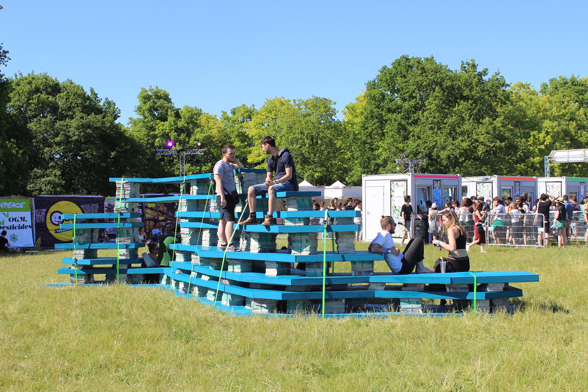 Conception et fabrication d'un meuble espace pour le festival We Love Green.Le mot d'ordre : éco-conception ! Le seul achat de matière première neuve fut pour les sangles à cliquet.Projet sélectionné à la suite d'un appel à projet.